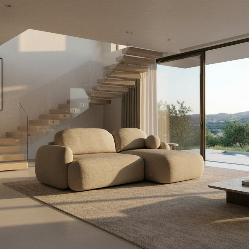 Fabriqué en tissu doux (à la texture délicate), il présente un design modulaire arrondi, ce qui lui confère une forme pleine et moelleuse offrant une expérience d'assise douce et enveloppante.